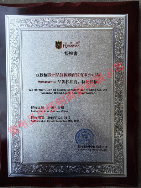 2016年8月2日貴州品質恒創(chuàng)商貿有限公司獲得漢美臣中國有限公司貴州地區(qū)獨家授權書